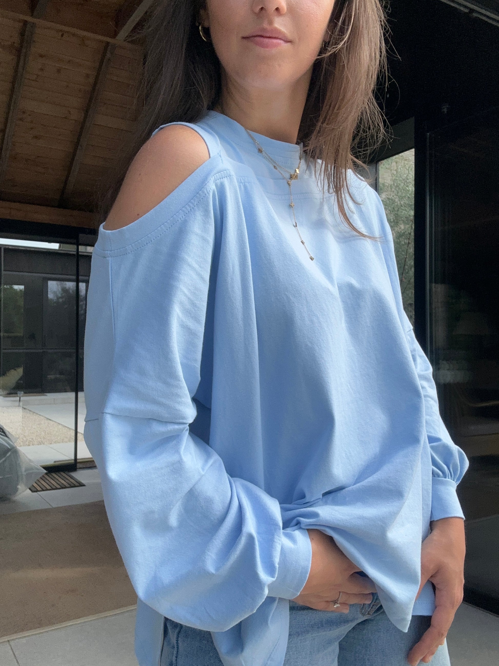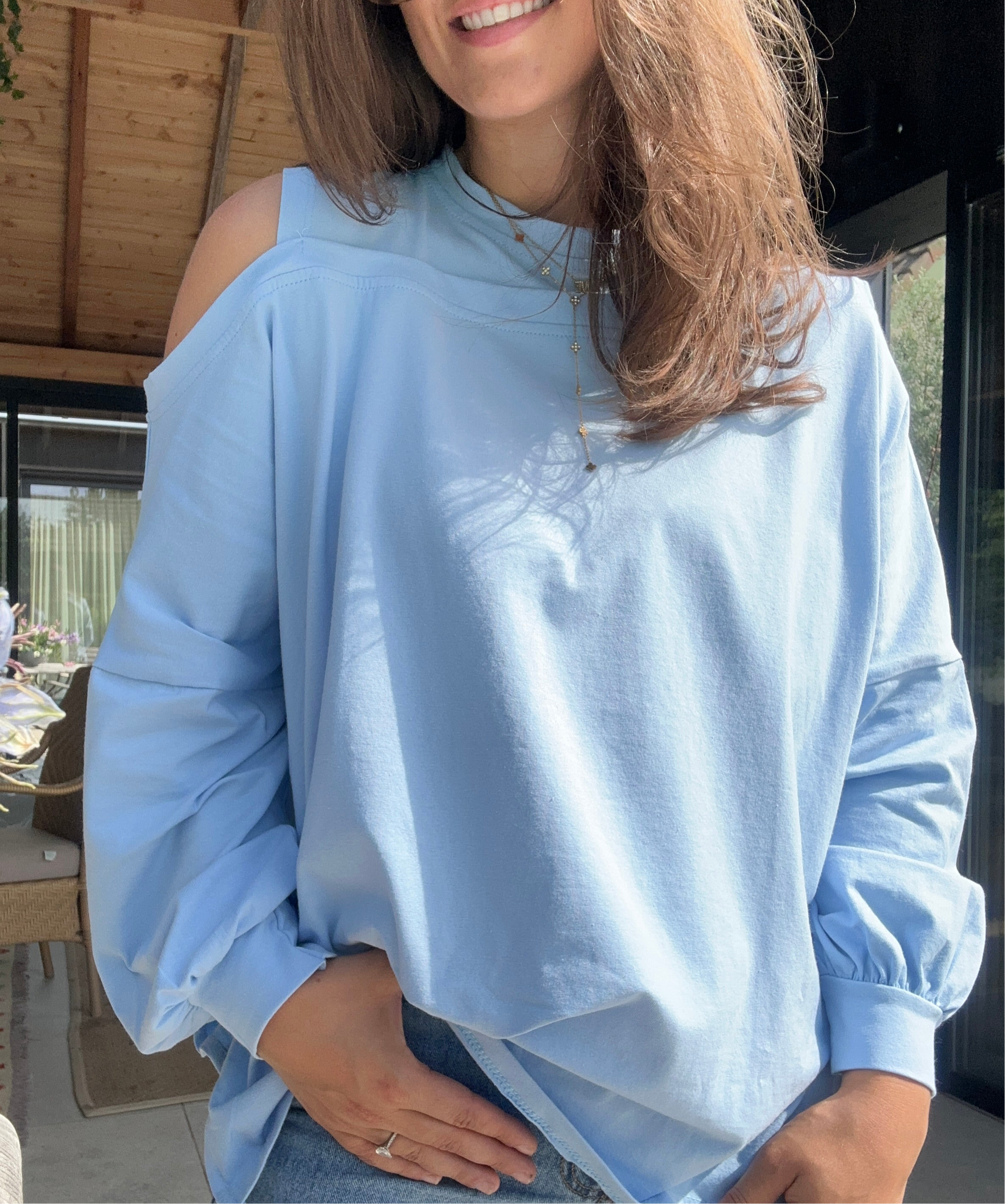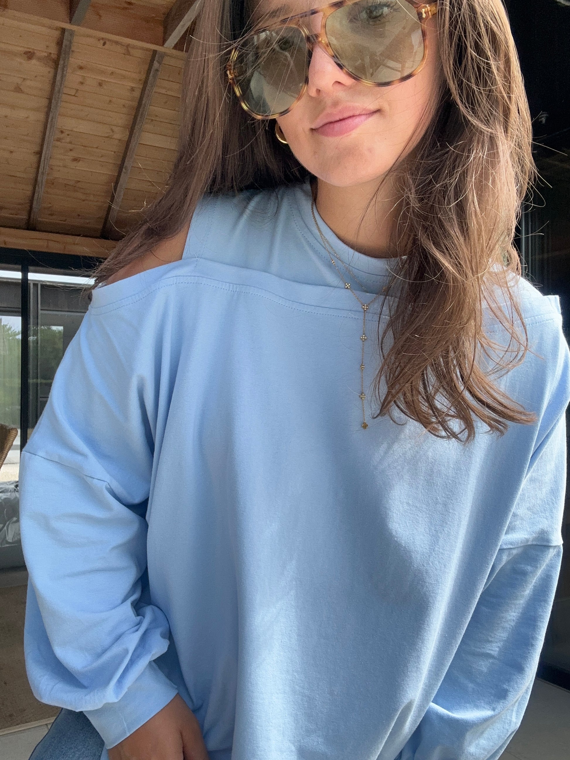 Estelle shirt in lichtblauw combineert een oversized fit met een stijlvol cut-out detail voor een moderne en speelse look. Dit luchtige shirt is perfect voor comfortabele casual fit.