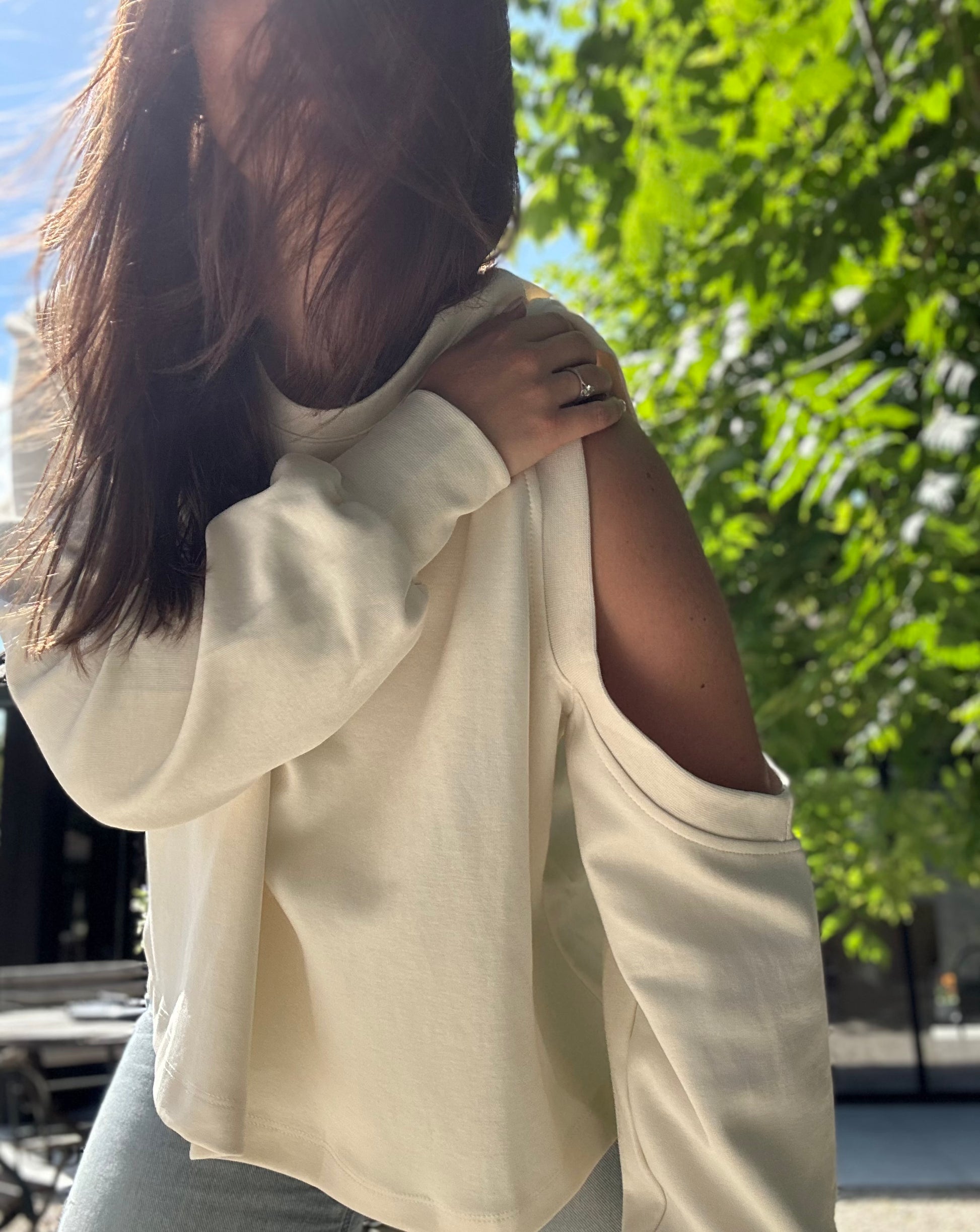 De Liz Sweater is de perfecte combinatie van comfort en stijl. Een zachte stof en trendy cut-out details aan de mouwen. De donkerblauwe kleur maakt deze trui tijdloos en ideaal op een coole jeans.