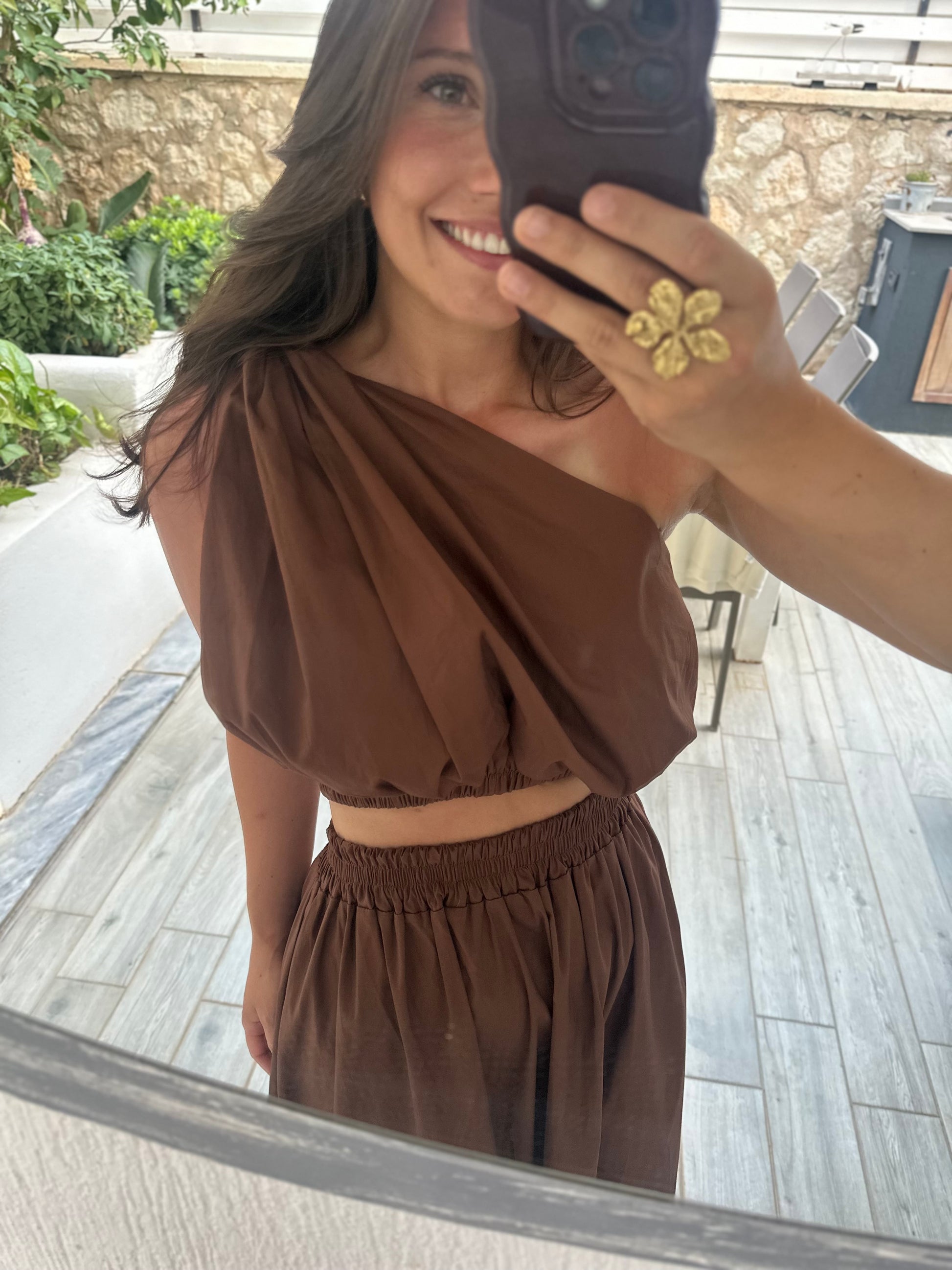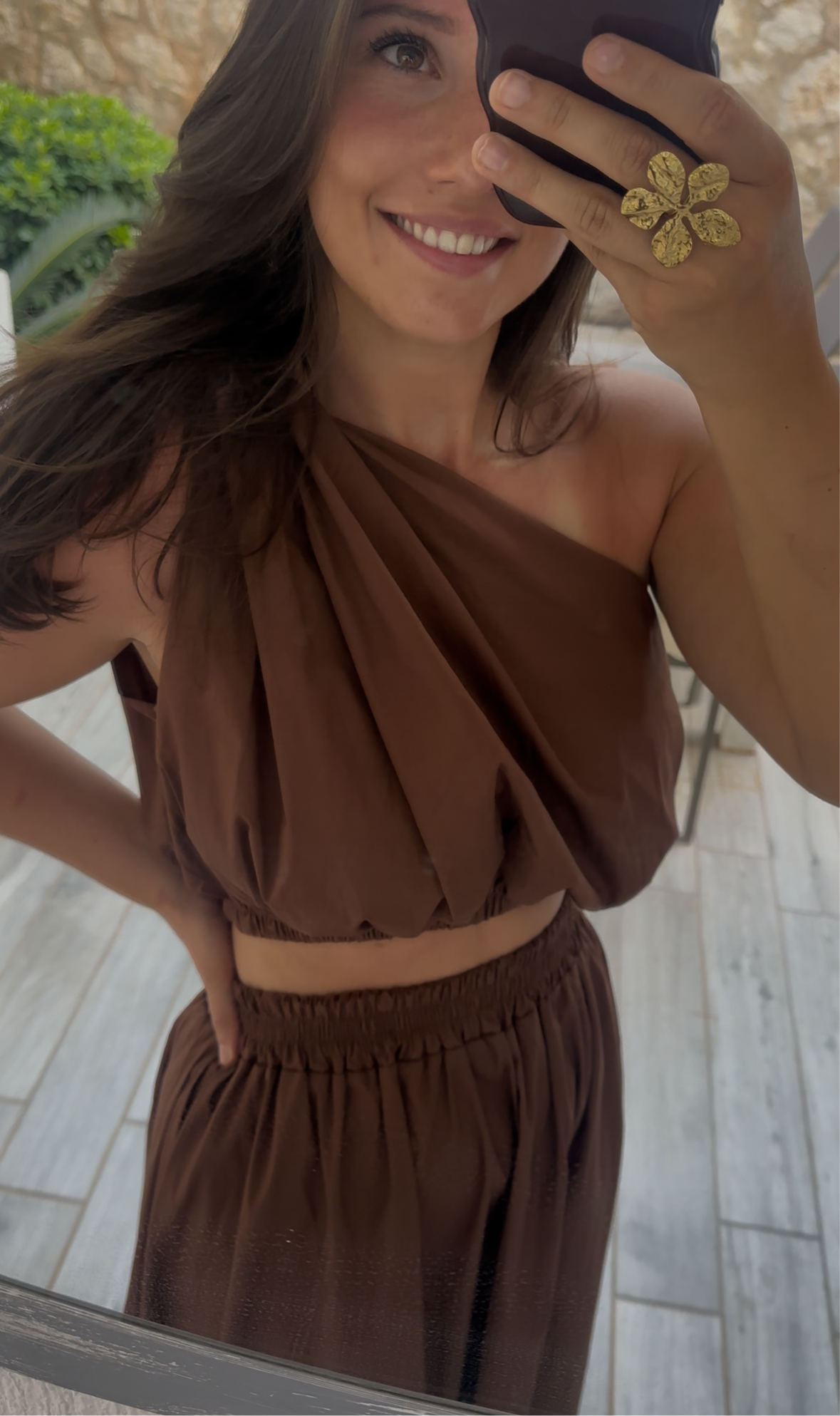 De Magalie set in warm bruin is een prachtige combinatie van een luchtige top en elegante rok. Deze set straalt moeiteloos stijl uit en is de perfecte keuze voor wie houdt van een vrouwelijke, comfortabele én chique outfit.