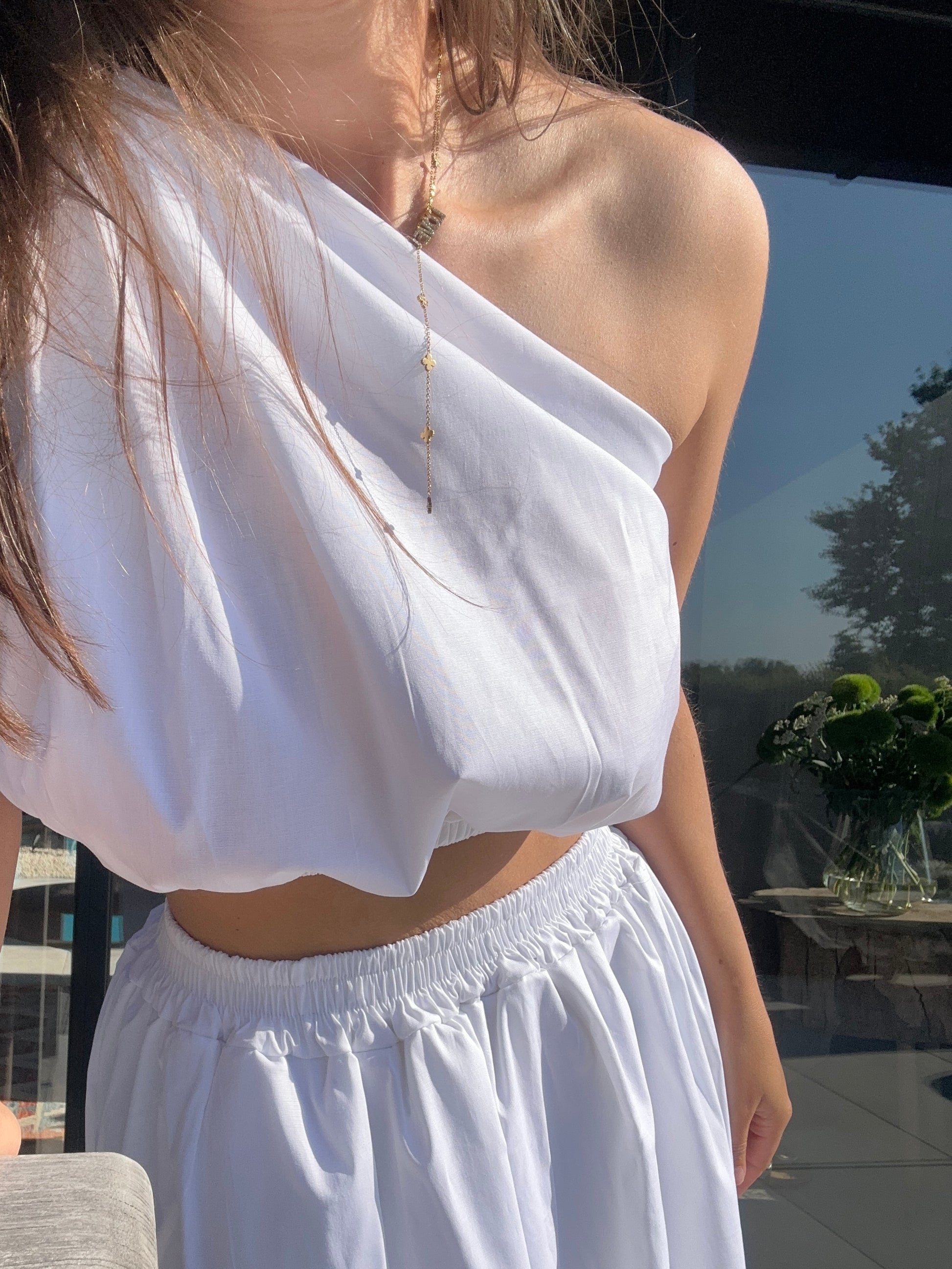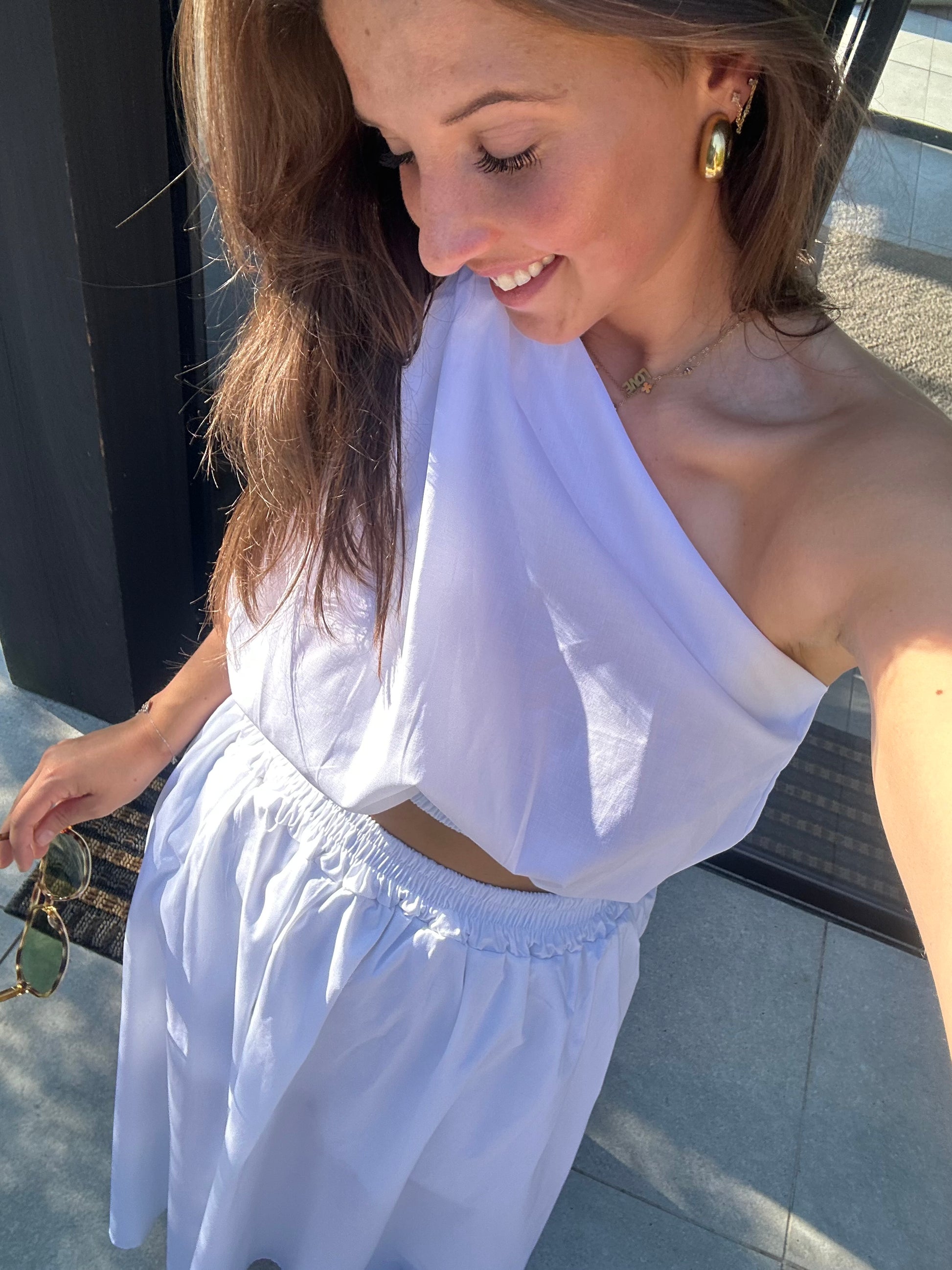 De Magalie set in wit is een prachtige combinatie van een luchtige top en elegante rok. Deze set straalt moeiteloos stijl uit en is de perfecte keuze voor wie houdt van een vrouwelijke, comfortabele én chique outfit.