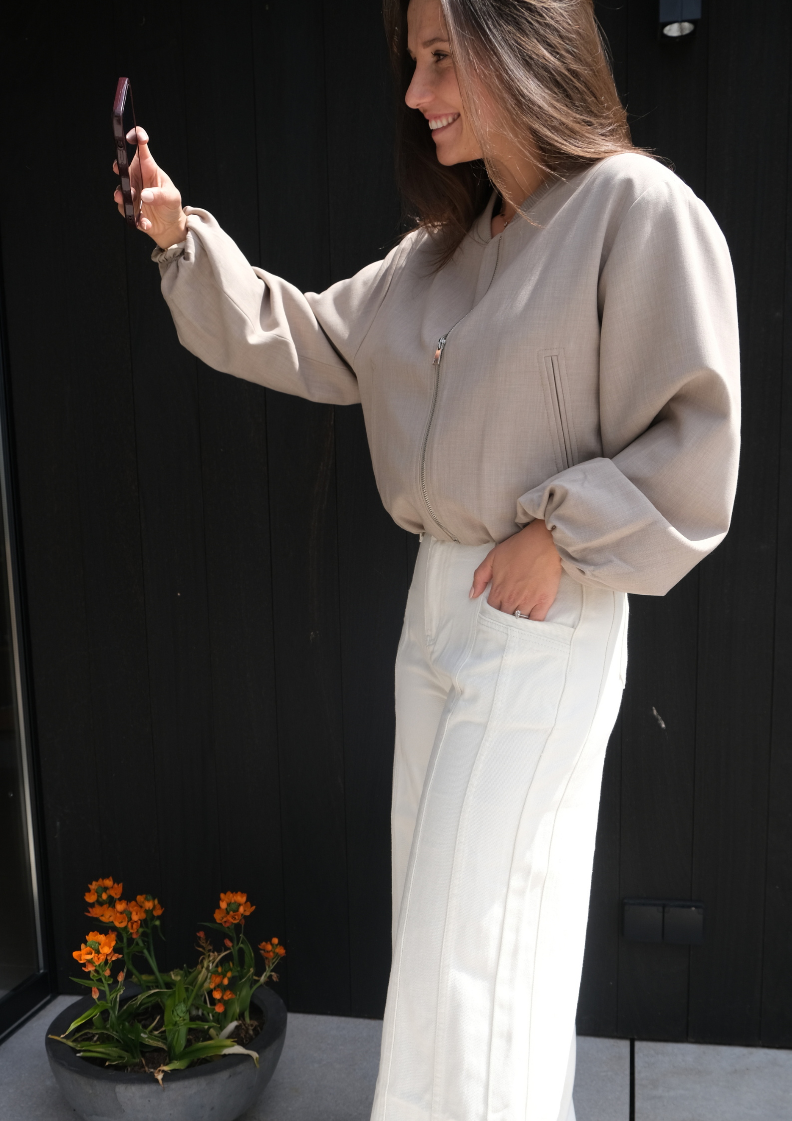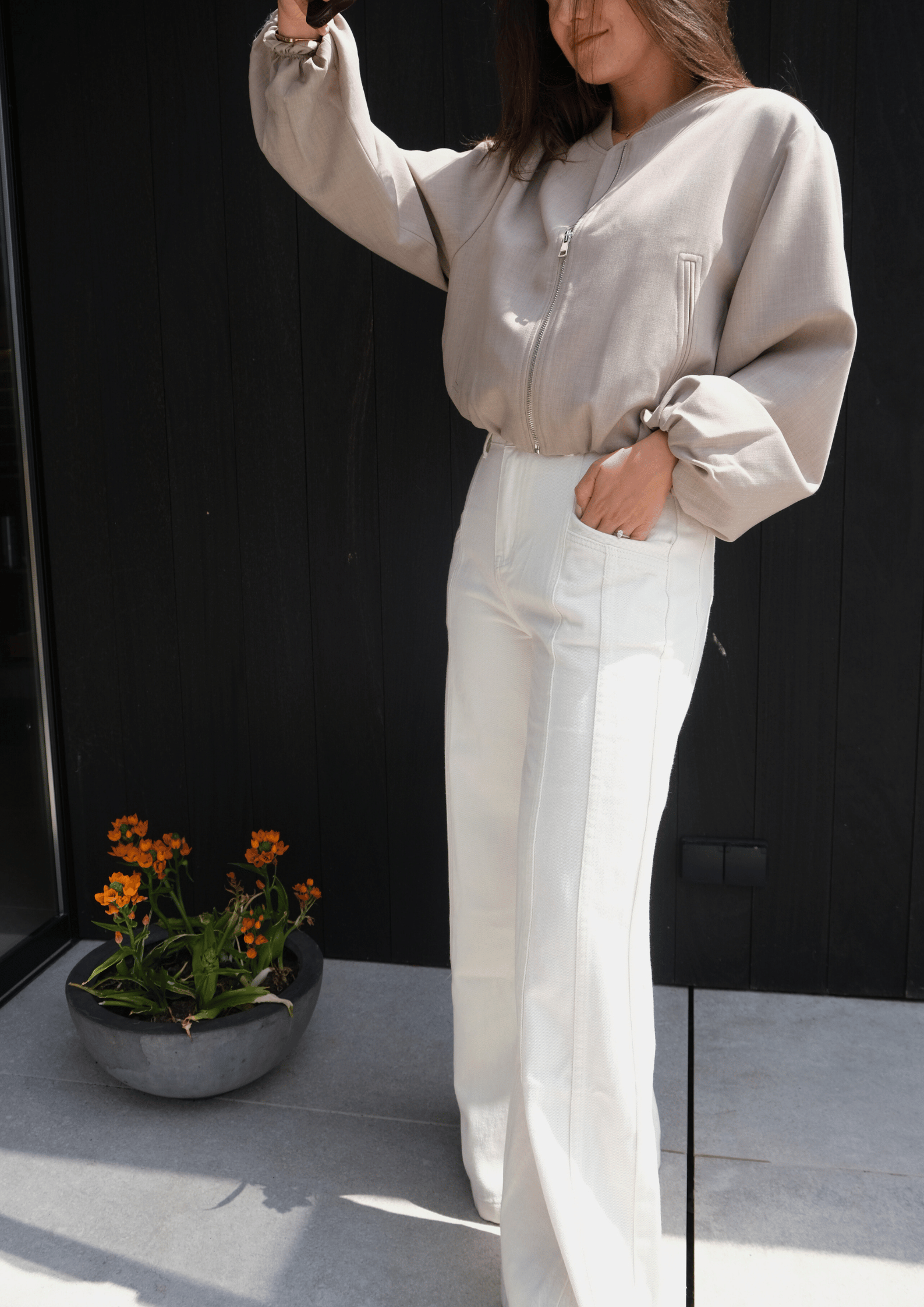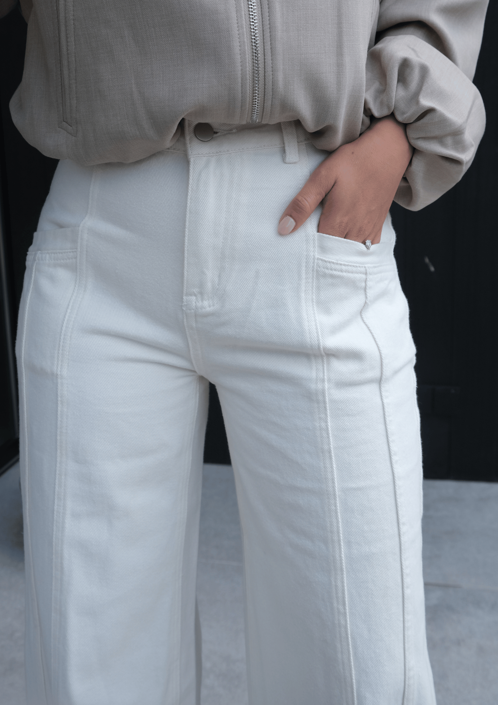 MORI PANTS – Soepele broek met opvallende stiksels en wijd uitlopende broekspijpen.