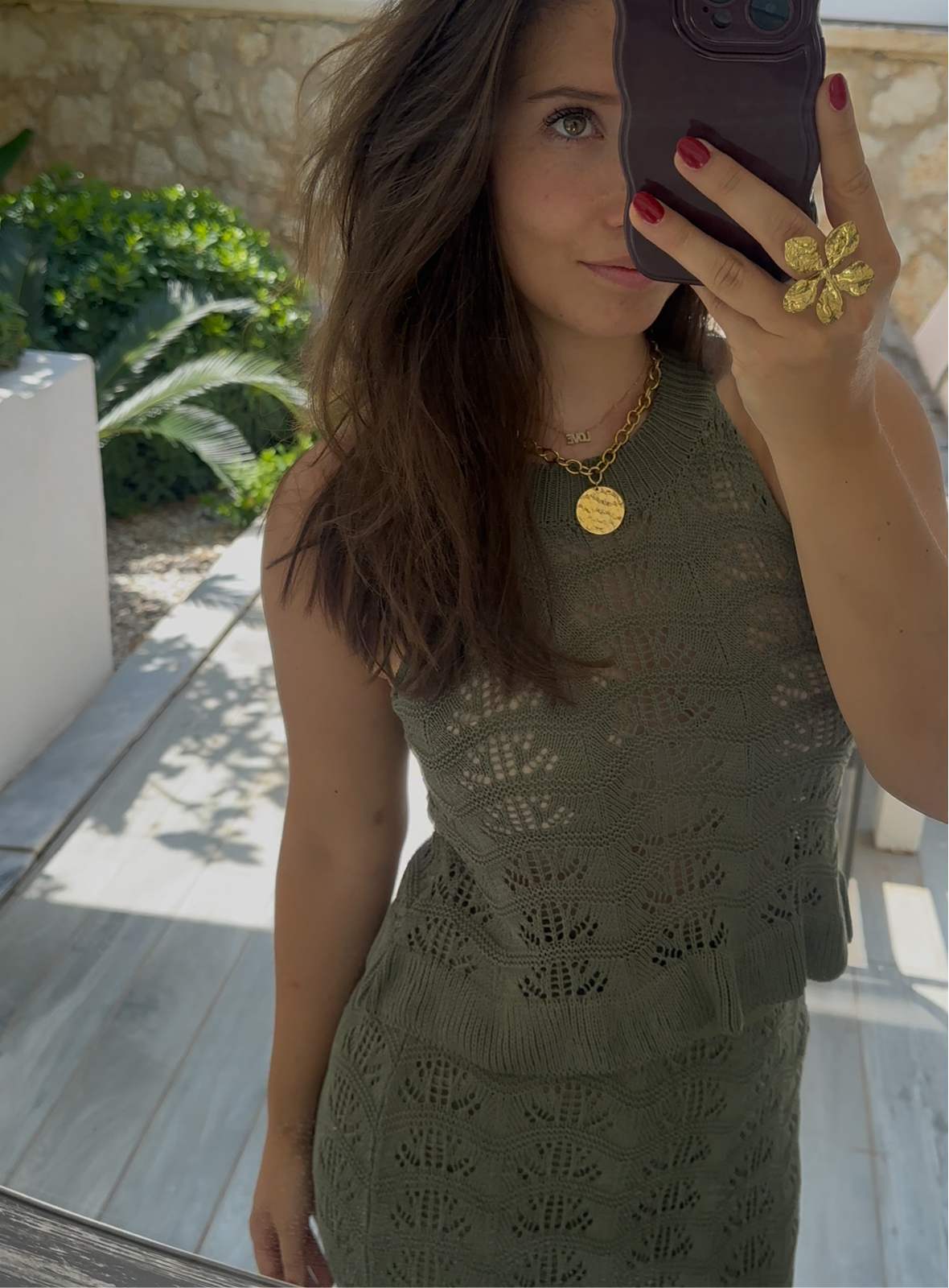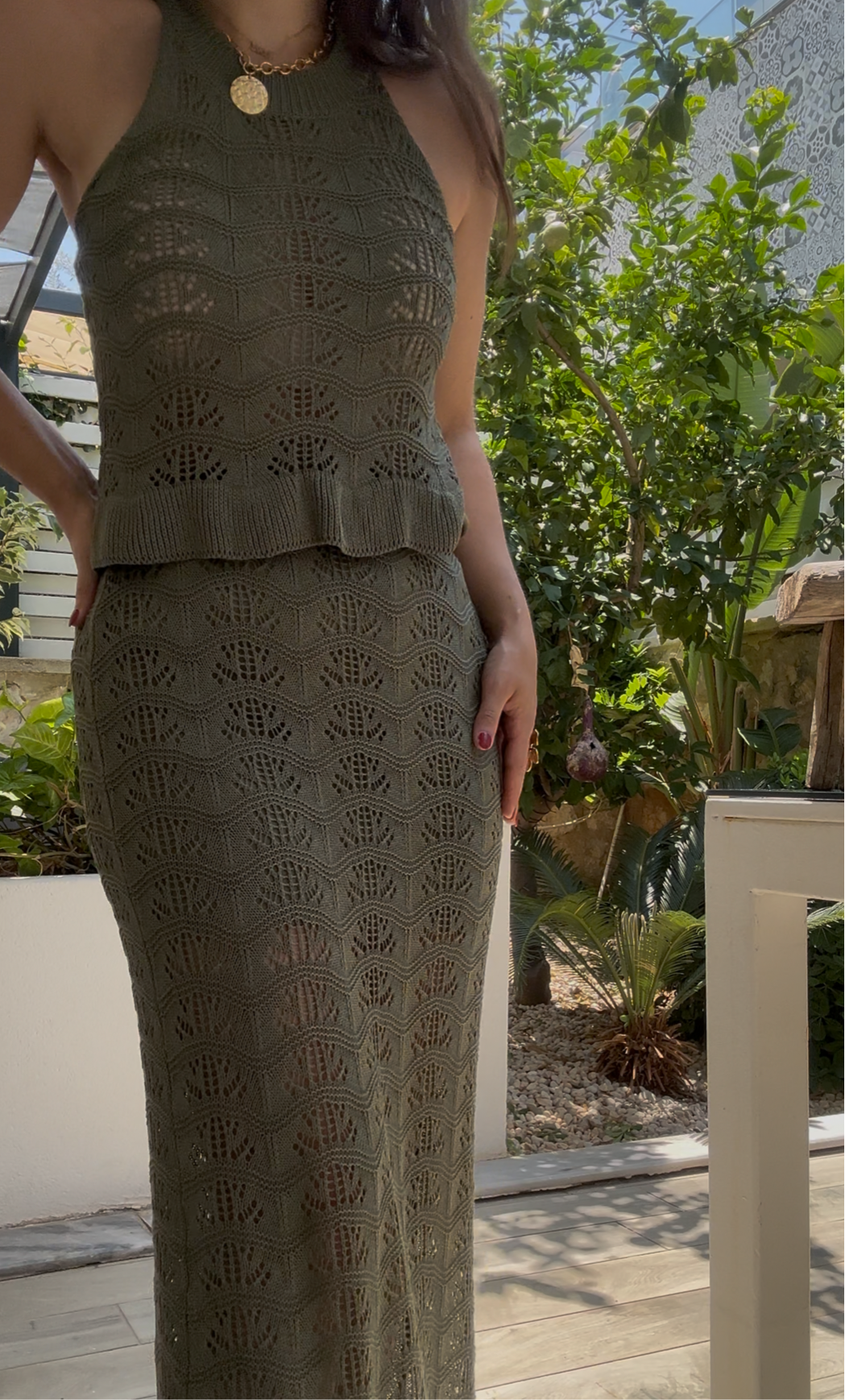De bijpassende lange rok heeft een nauwsluitende pasvorm, is bovenaan gevoerd en eindigt in een golvende, sierlijke zoom. De opengewerkte knitstructuur geeft de set een luchtige en vloeiende look, perfect voor zonnige dagen of chique gelegenheden.