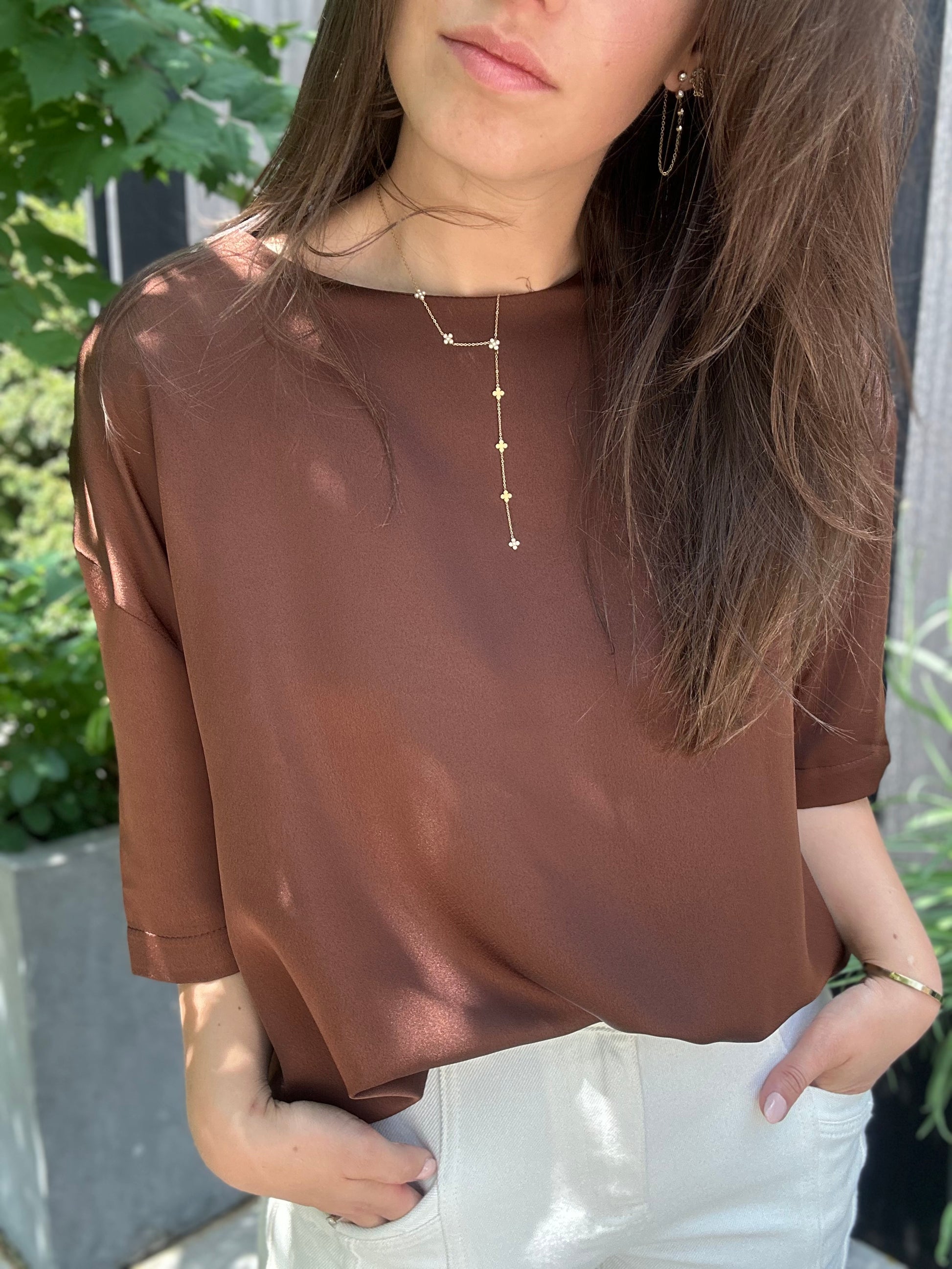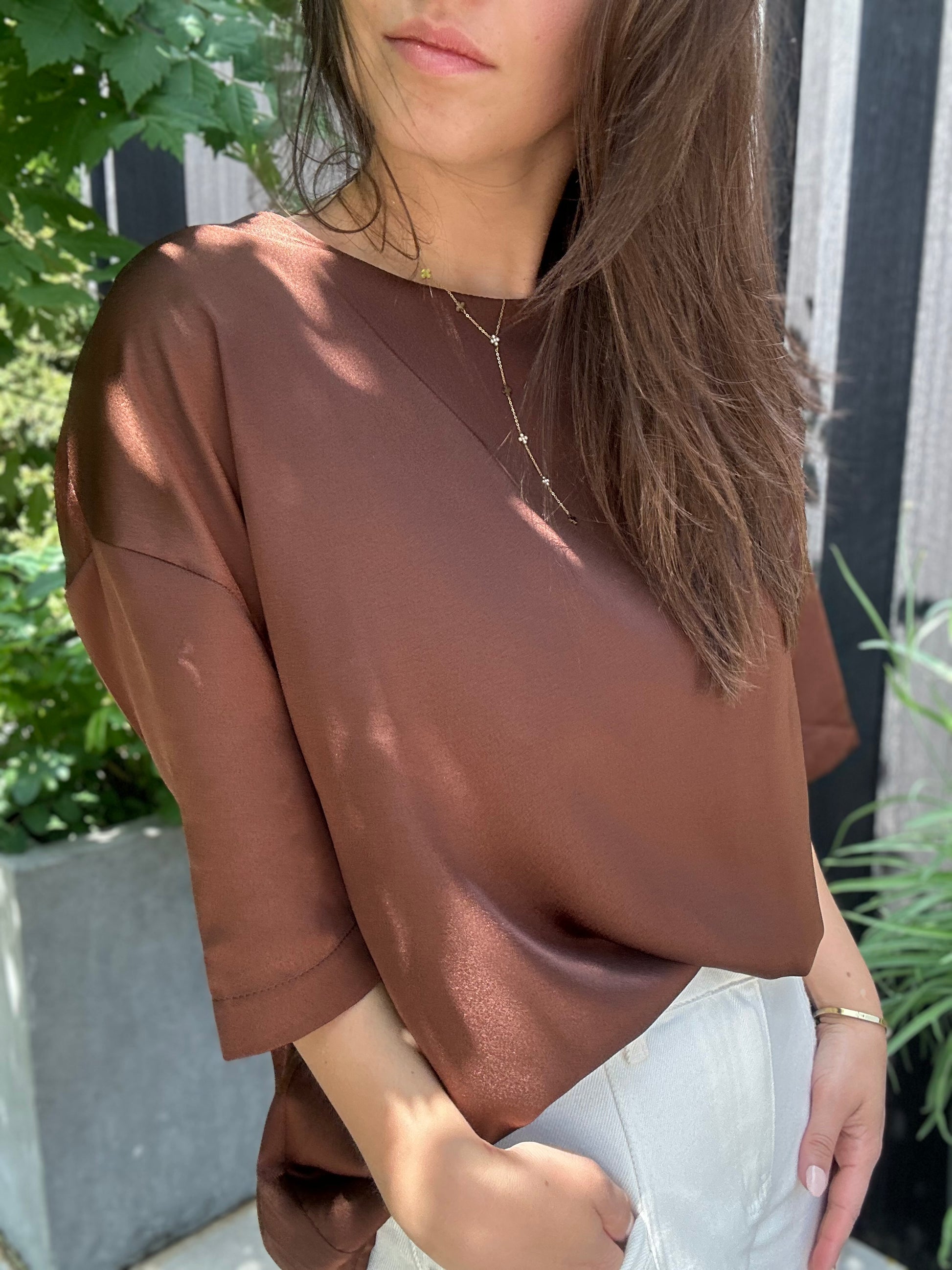 Satijnlook T-shirt in bruin. Mooi met ecru en gouden accesoires voor een casual chic look.